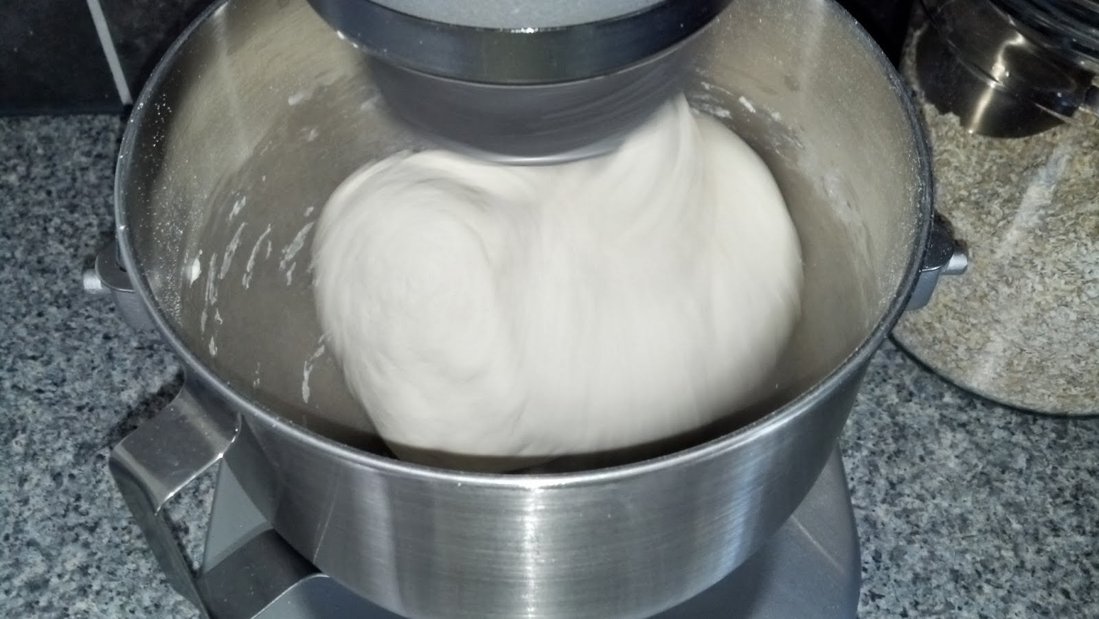 Start to mix....it should really only take about 4 minutes. The dough will start to pull away from sides and form a ball on the hook. It should not really stick to your fingers too much, if it does add a bit more flour.